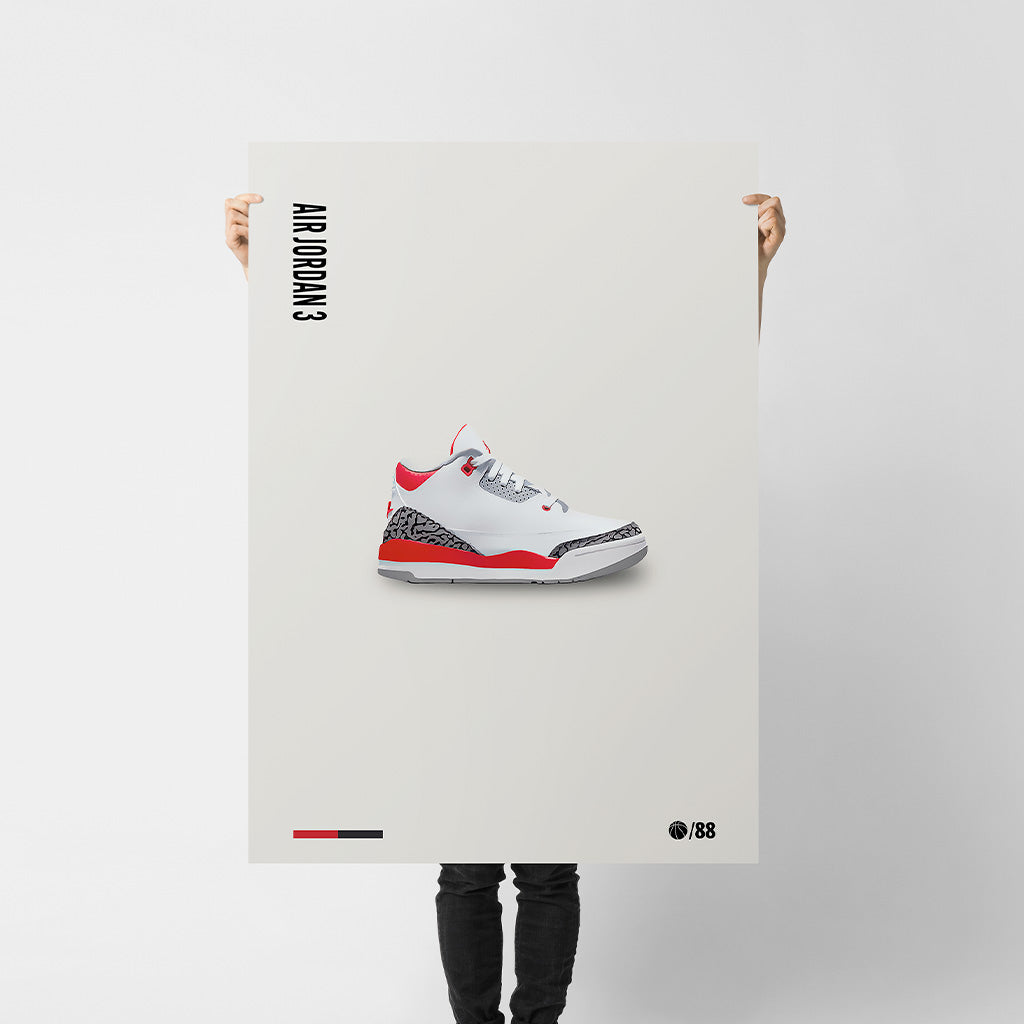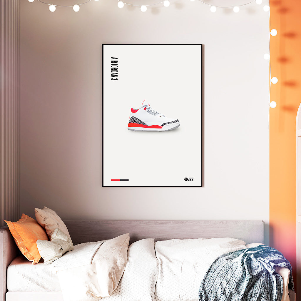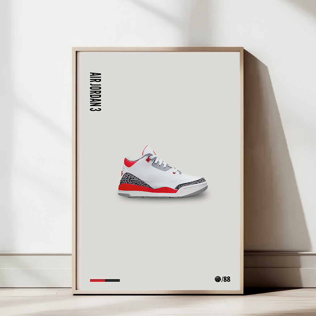 Celebrate one of the most iconic sneaker designs of all time with this minimal Air Jordan 3 art print, featuring the legendary elephant print detail. Designed with crisp, clean lines and bold graphic elements, this poster perfectly captures the timeless style and cultural impact of this classic silhouette.