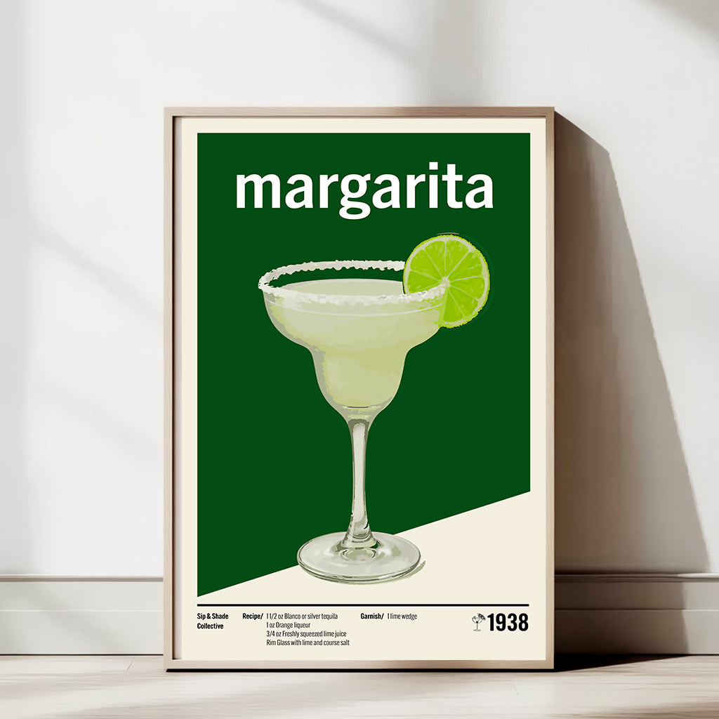 Celebrate the ultimate party classic with this minimalist Margarita art print. Featuring crisp green tones, a bold lime accent, and the complete recipe, this design captures the refreshing zest and laid-back spirit of this iconic tequila cocktail.