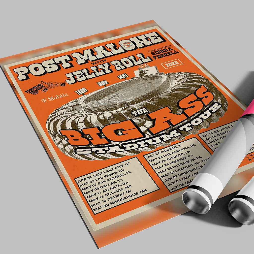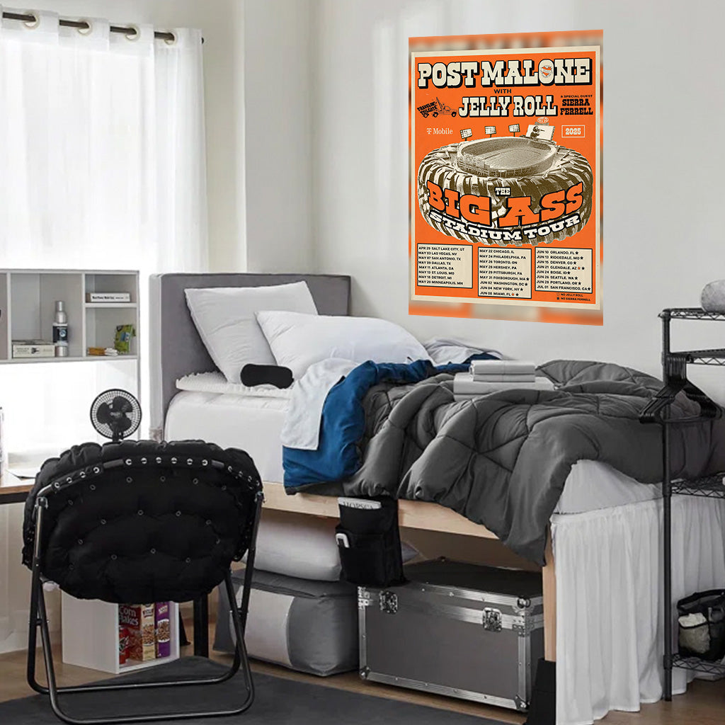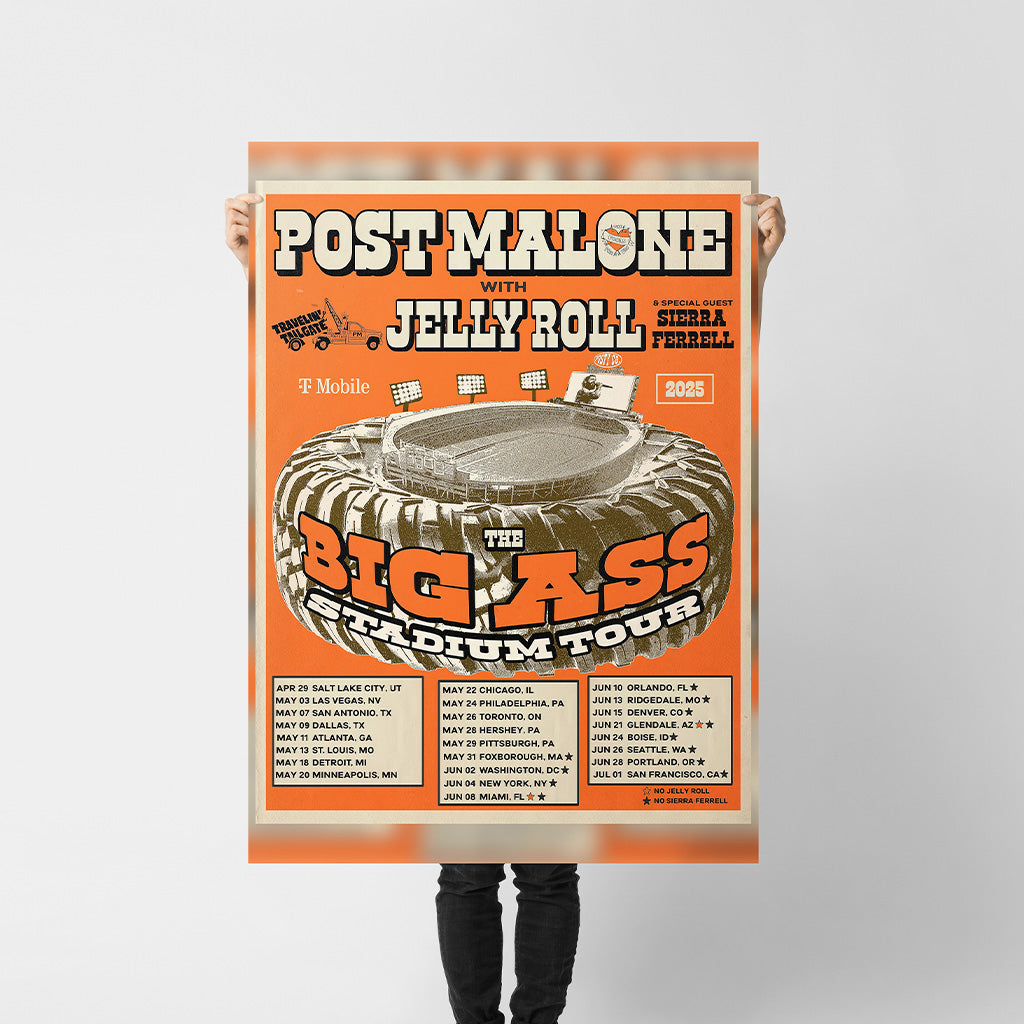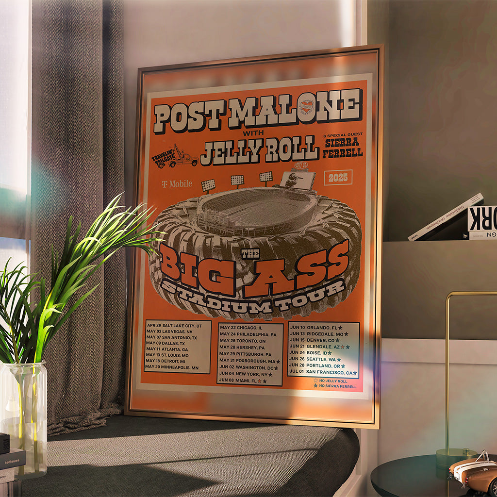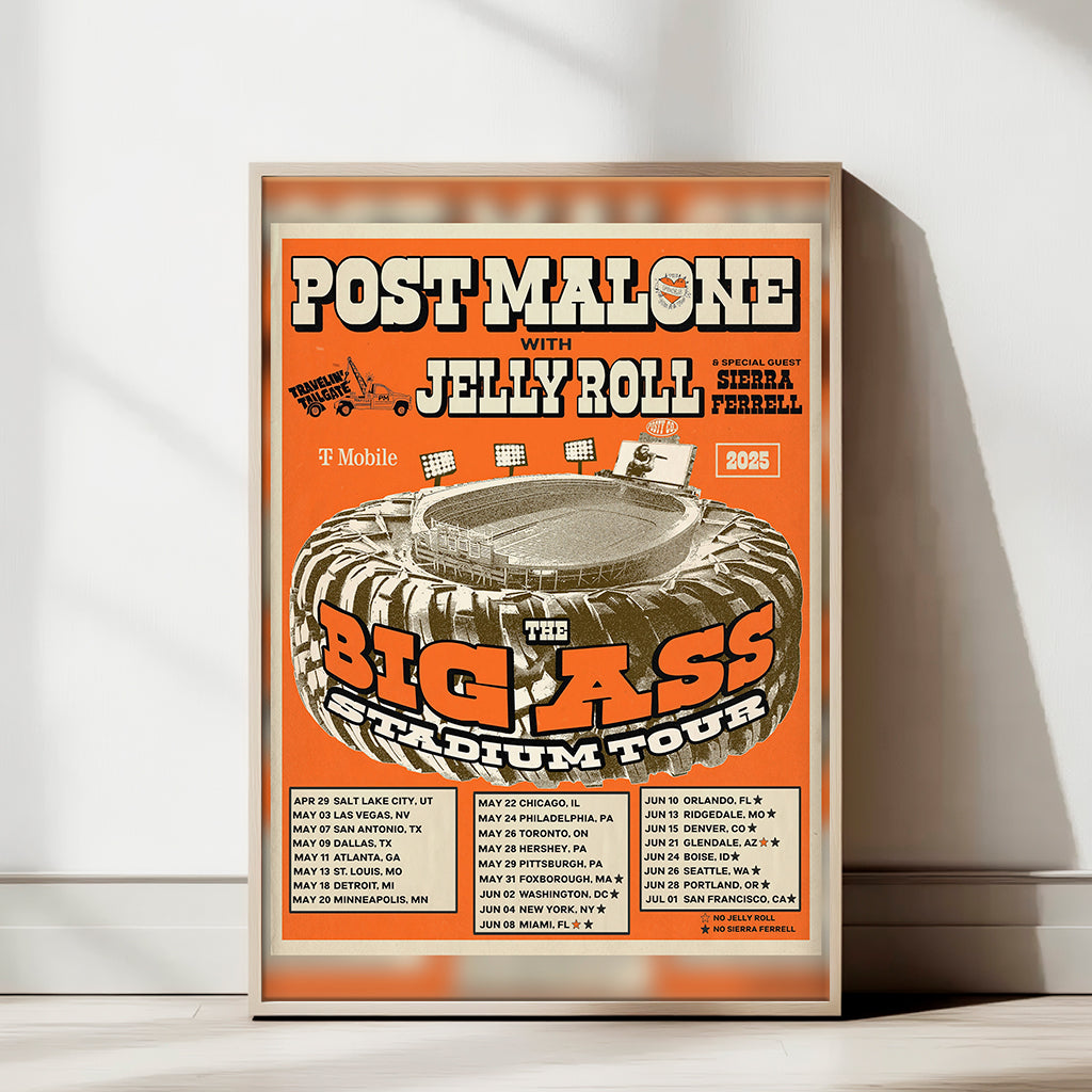 Celebrate the ultimate stadium experience with this bold retro-inspired poster featuring Post Malone’s Big Ass Stadium Tour with Jelly Roll and special guest Sierra Ferrell. Designed with vintage vibes and vibrant orange tones, this print captures the electrifying energy of the 2025 tour.